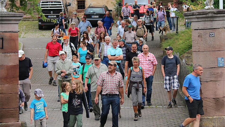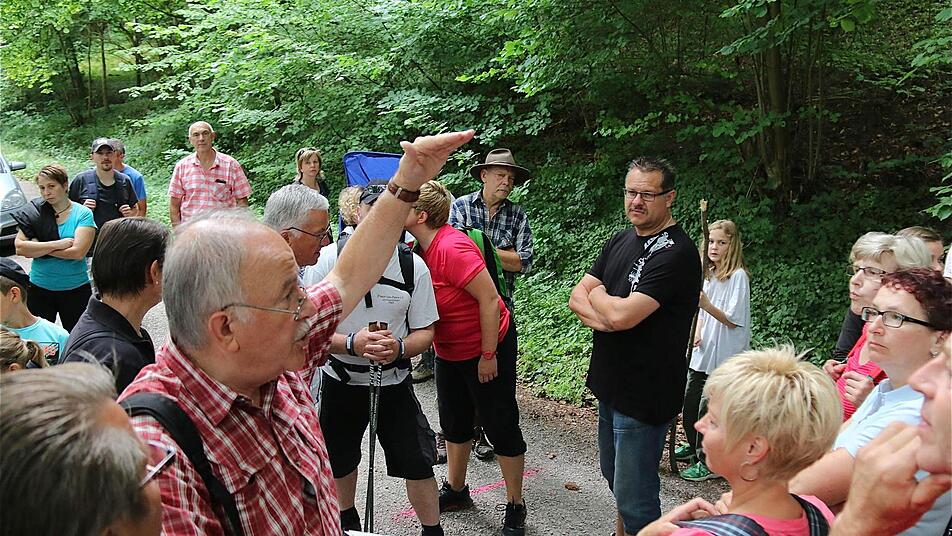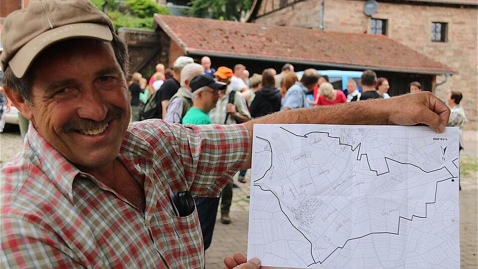 Feuerwehrvorsitzender Günter Hummel informiert über äußerst weit in Richtung Obereschenbach gelegene Wohnhäuser, die entgegen dem optischen Eindruck noch zum Untereschenbacher Gebiet zählen. Von der Zentgrafenhalle führt die Strecke, die rund zehn Kilometer lang und mit 233 Grenzsteinen markiert ist, die Teilnehmer zunächst in Richtung Lehmgrube. Dann geht es zur Eichhecke und längs der Hammelburger Grenze. Anschließend führt die Tour bergauf zum Dreimärker und in Richtung der Obereschenbacher Dürrmühle.