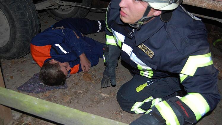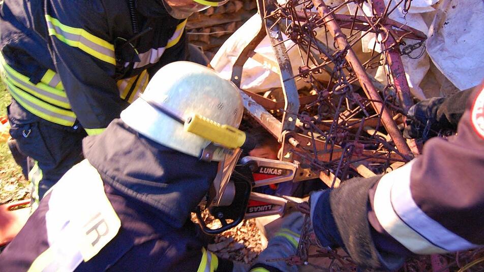 Maschine mit Spreizer anheben Etwas schwieriger gestaltete sich die Rettung der zweiten Person. Sie war unter einer Erntemaschine eingeklemmt. Die Maschine musste mit dem Spreizer angehoben und mit Holzklötzen unterbaut werden, um den Burschen zu retten.