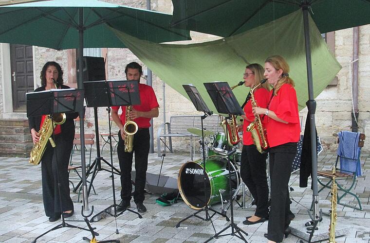 Der kurz vor Konzertbeginn einsetzende Regen zerstörte die Hoffnung der Musiker und des Veranstalters auf guten Besuch zahlreicher Freunde von "In the Mood"-Rhythmen. Das Quintett "Sax4Session", ein Saxophon-Ensemble der Stadtkapelle mit Schlagzeuger, ließ sich jedoch nicht vom Kurs abbringen. Unter einem schnell erbauten, behelfsmäßigen Sonnenschirmdach, das die Akteure und Instrumente einigermaßen schützte, leiteten sie die Sommerkonzertreihe auf dem Viehmarkt ein. Die naheliegende "Wirtschaft am Viehmarkt" sorgte für die Bewirtung der Zuhörer unter Regenschirmen.
