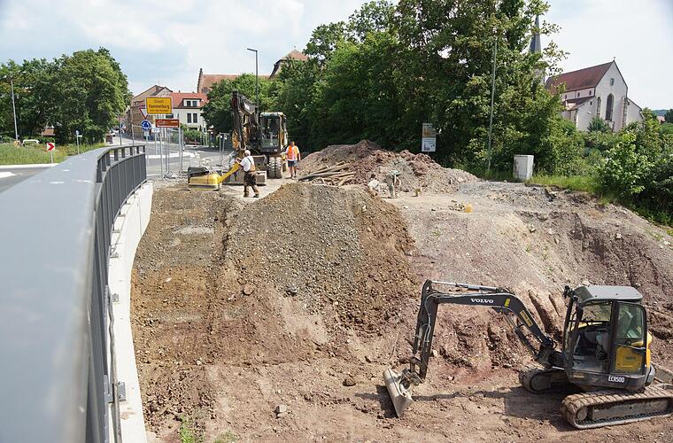 Dort, wo einst das Widerlager der alten Brücke ruhte, planieren Arbeiter die Fläche, um einen kleinen Platz anzulegen. Auf ihm soll die Marienfigur einen neuen Standort finden.