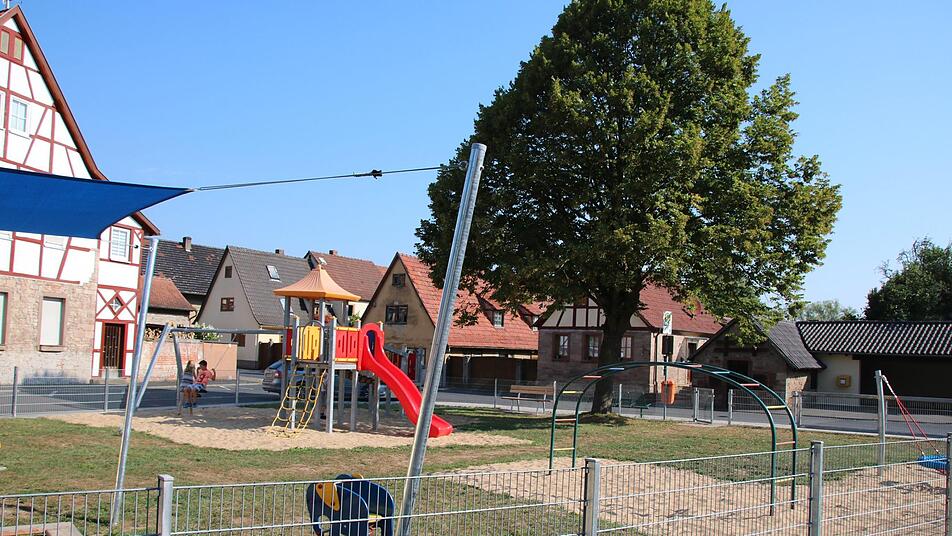 Als erstes fällt an dem Spielplatz die schöne alte Linde auf. Sie spendet zumindest einem Teil des rund 500 Quadratmeter großen Areals Schatten. Ein weiterer Baum auf dem Grundstück wurde zwar im Rahmen der Erneuerung gefällt, dafür hat die Stadt Hammelburg aber an zwei Sonnensegel gedacht: Ein blaues Tuch schützt den Sandkasten, ein rotes die Sitzgruppe zumindest vor der Mittagshitze. Dabei ist der Spielplatz, vermutlich wegen seiner Lage mitten in Untereschenbach, der einzige im diesjährigen Test, der eine Mittagspause vorschreibt: Laut Schild am Eingang sollen die Geräte von 13 bis 15 Uhr und abends ab 20 Uhr Pause haben.