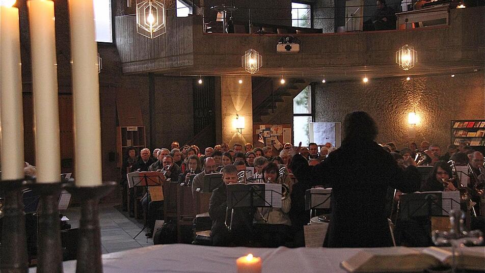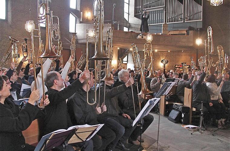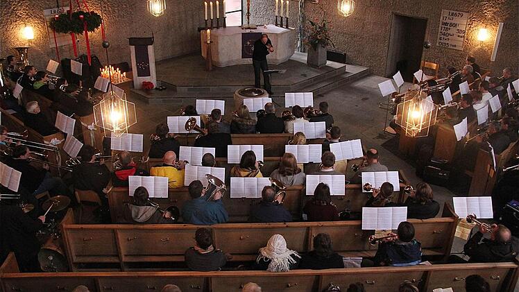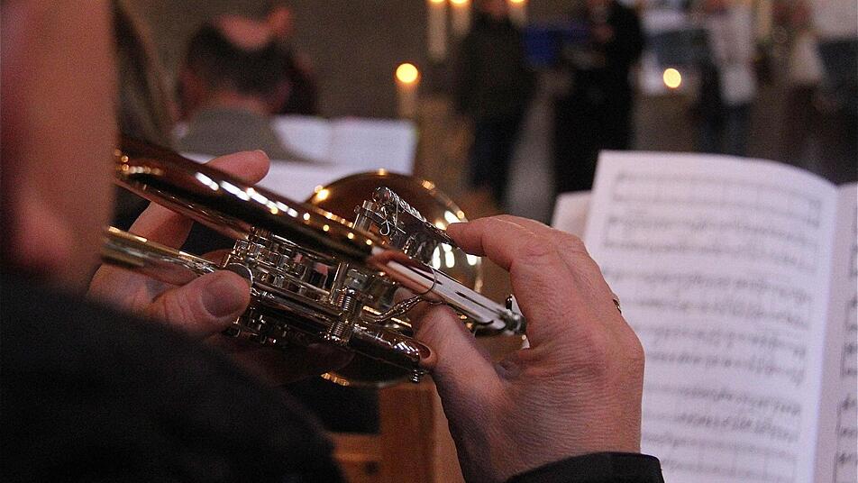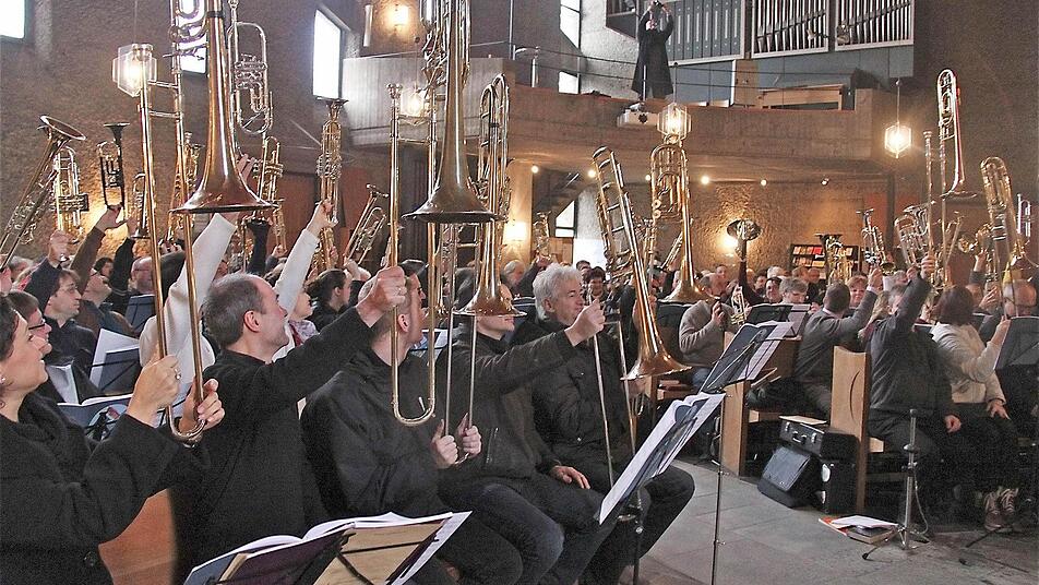 Die Instrumente knapp 90 Bläser des Verbandes evangelischer Posaunenchöre Bayerns gehen zum Abschied hoch nach oben in die Luft. Diese Musiker gestalteten am zweiten Advents-Sonntag den Gottesdienst in der St-Michael-Kirche wesentlich mit.