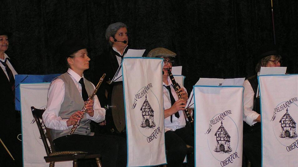 Jetzt war das Obertor mit seiner Obrigkeit Sonja Deinert, Liane Glaser und Verena Schindler, am Zuge. Am Anfang wurde an die verstorbene Minka Macek gedacht, die lange Jahre aktiv dabei war. Im Anschluss berichteten sie vom gestohlen Maibaum und den Neuwahlen im Bugviertel. Während das Publikum schunkelte und tanzte, konnten sich die Akteure für ihren Auftritt umziehen. Und dann kamen schon die ersten zur Bühne geschlurft, als Musiker der Vielharmonie. Natürlich wurde auch über den Kapellmeister (Marga Tremer) gelästert, bis er dann erschien. Die Töne zu treffen war bei der "Kuvertüre" noch schwierig, doch "wenn spielt die Vielharmonie - dann rocken die Knie - denn sie spielen wie noch nie". So war das Publikum am Ende total entzückt über diese großartige Leistung des Orchesters.