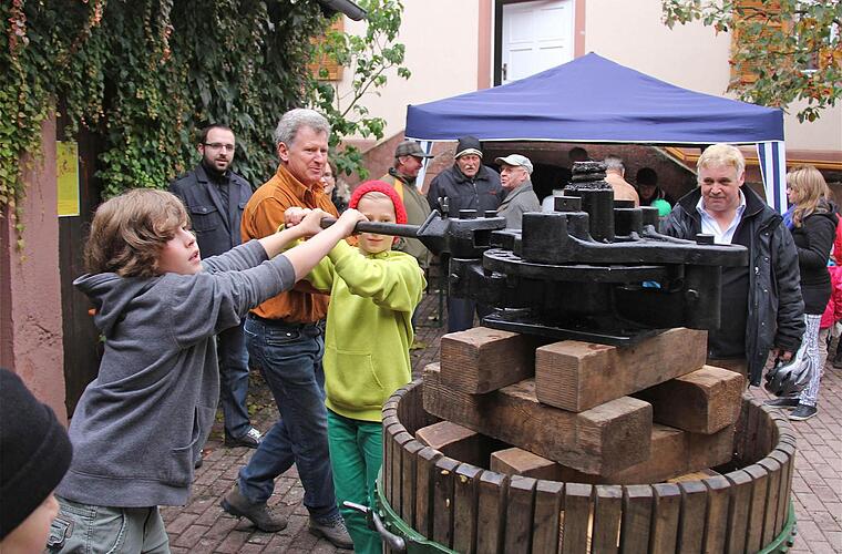 Ihren Spaß haben die Jugendlichen Moritz, Noah und Felix, wenn sie zusammen den langen Hebel an der Apfelkelter bedienen. Beim vierten Kelterfest im Pfarrhof Windheim füllten sich nach und nach Hof und Zelt mit Besuchern.