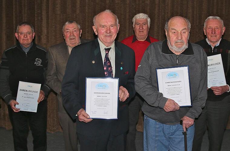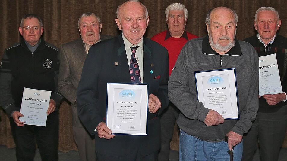 Im Mittelpunkt der Ehrungen standen zwei verdiente CSU-Mitglieder, nämlich Altbürgermeister Rudolf Winter (55 Jahre CSU-Mitglied) und Bruno Koberstein (ebenfalls 55 Jahre Mitglied. Beide erhielten die hohe Auszeichnung der Raute in Bronze. Hugo Pfrang wurde für 35-jährige Mitgliedschaft geehrt und für 30 Jahre Hermann Kleinhenz und Julius Fella. Theodor Busch ist seit 25 Jahren Mitglied im Ortsverband. Seit 20 Jahren sind Paula Vogler, Gerda Busch und Otto Winter dabei.