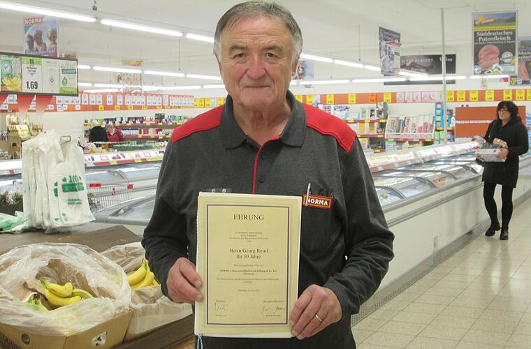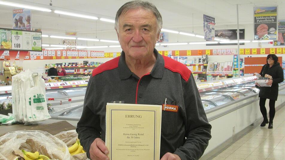 Ein seltenes Arbeitsjubiläum kann Georg Reinl feiern, der seit 50 Jahren dem Lebensmittel-Discounter "Norma" die Treue hält. Eigentlich im Ruhestand, ist seine jahrzehntelange Erfahrung und seine Mitarbeit auf Teilzeitbasis in der Filiale Hammelburg noch immer gefragt.