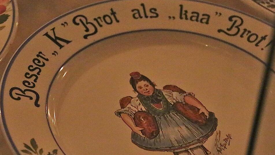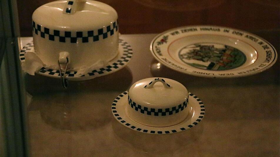 Die Schauvitrinen füllten sich zum Beispiel mit themenbezogenen Krügen und Geschirr. "Besser K-Brot (Kommissbrot) als kaa (kein) Brot" steht auf einem Tellerrand. Auch ist anhand der kleinen Butterdosen zu sehen, wie die Kriegsarmut zuschlug.