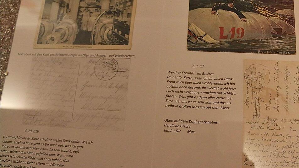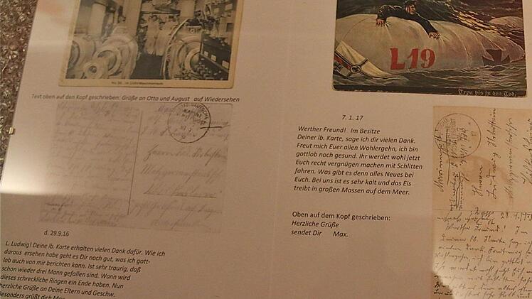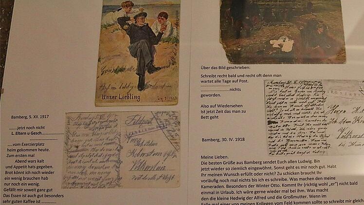 So schrieb ein Max im September 1916 auf eine Postkarte: "Lieber Ludwig, ... es ist sehr traurig, dass schon wieder drei Mann gefallen sind. Wann wird dieses schreckliche Ringen ein Ende haben?" Auch über die Soldatenausbildung 1917 in Bamberg wurde berichtet: " ... vom Exerzierplatz heim gekommen heute. Abends war´s kalt und Appetit hat´s gegeben."