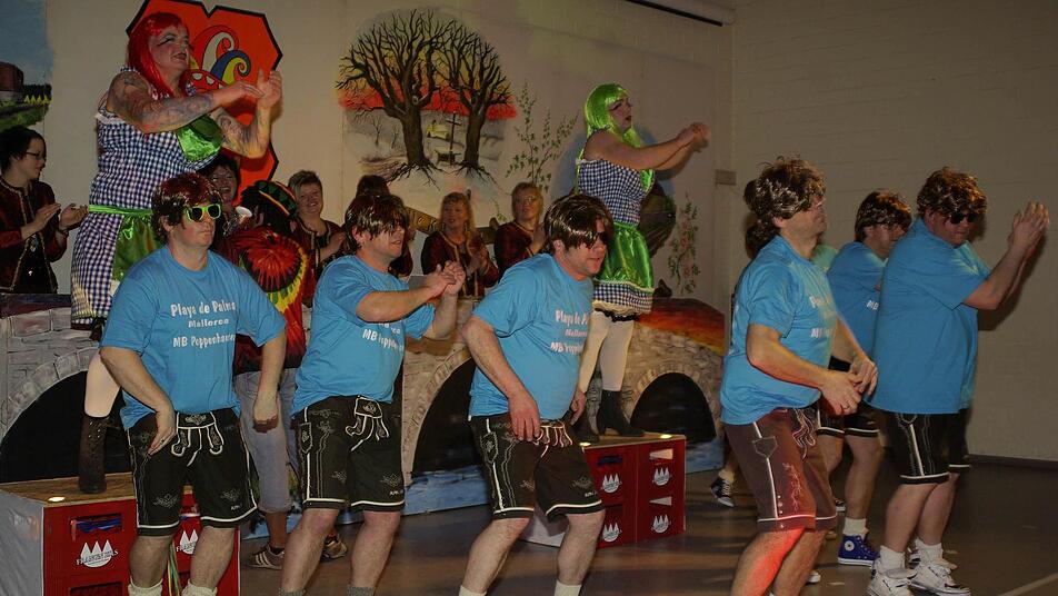 Zunächst männlich-stahlhart als American Footballplayers, dann - nun ja - "zuckersüß" als Cheerleaders, gaben die "Chippendales" aus Wartmannsroth ihre Visitenkarte ab. Die Damen im Saal waren sich einig: Aus den Jungs kann noch was werden. "Bist du braun, kriegst du Frau'n" lautete die Parole des Männerballetts aus Poppenroth. Die Beachboys vom Playa de Palma auf "Malle" schielten nach knackigen Bikini-Trägerinnen, allerdings in Lederhosen.