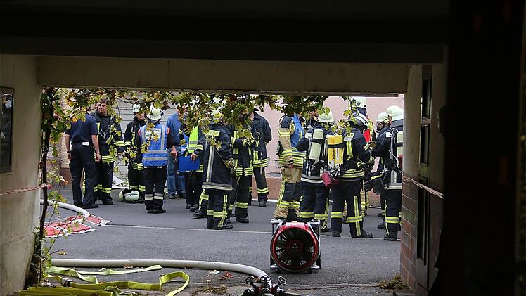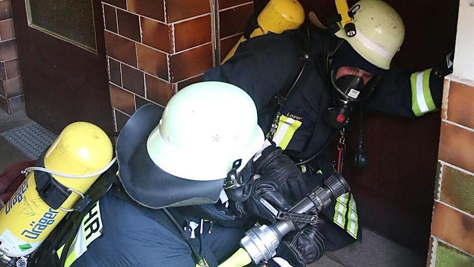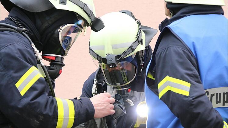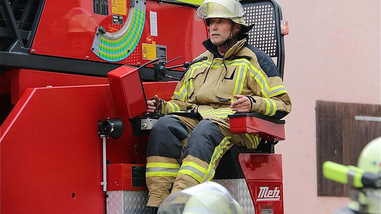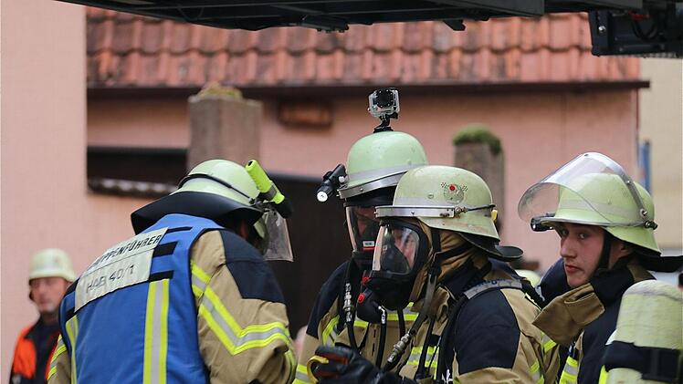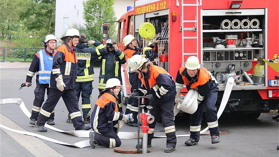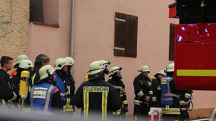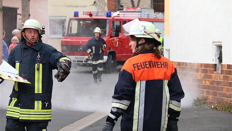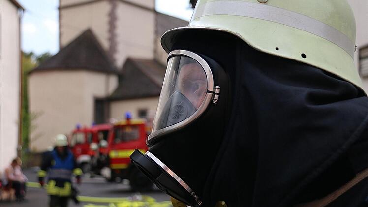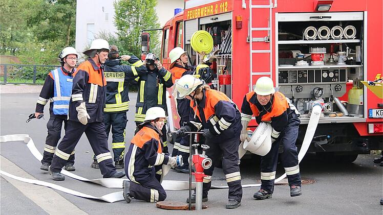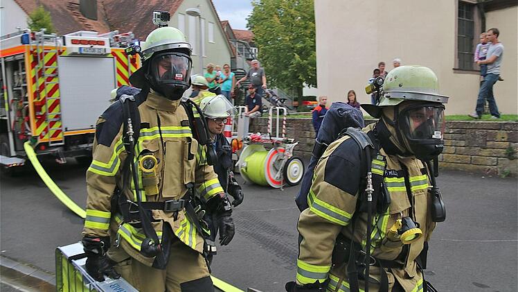 Die Dorfjugend hatte schon einen Logenplatz an der Friedhofsmauer eingenommen und sich mit La-Ola-Wellen die Wartezeit vertrieben. Schnell war die Westheimer Wehr unter der Einsatzleitung ihres Kommandanten Stefan Müller vor Ort. Atemschutzmasken und Druckflaschen wurden umgeschnallt, Schläuche ausgerollt und der Hydrant angezapft. Wasser kam aber auch über eine Schlauchstrecke aus der Saale und aus den Fahrzeugtanks.