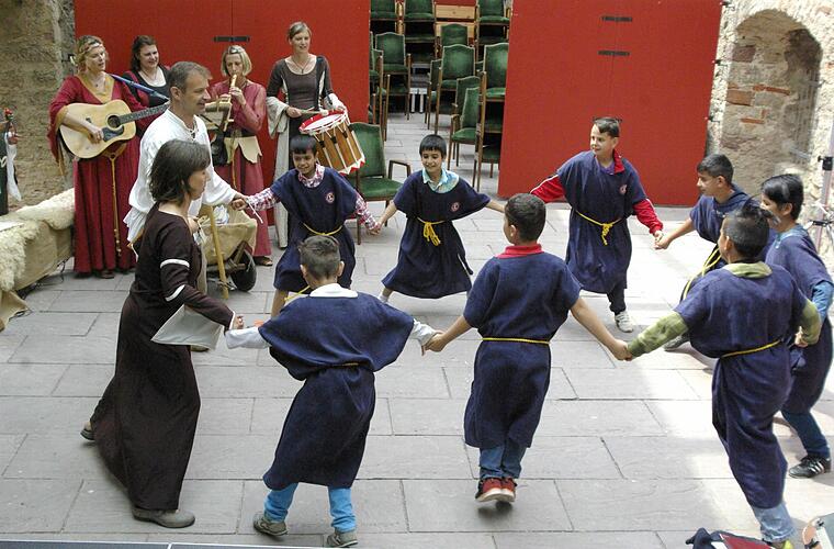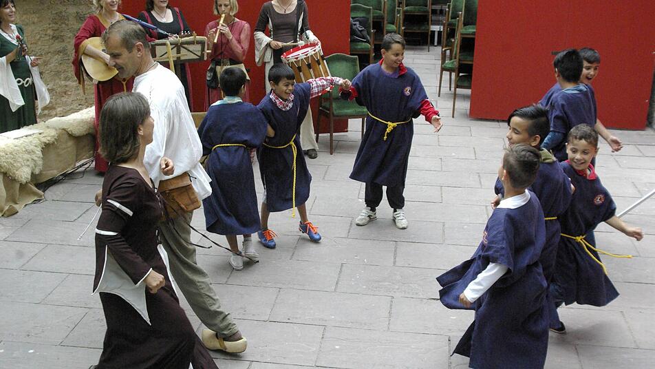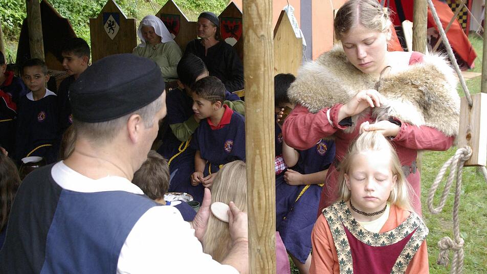 "Hugo von Trimberg", alias Matthias Schiebl, den die Historiengruppen "Sir Galahad" aus München, die Burgwächter von "Custor Castelli" aus Gauaschach, die Bamberger Kastellans-Familie von Grauberg, die "Troubadours" aus Fuchsstadt und Mitglieder des walisischen Clans Sgreimle Solais begleiteten, begrüßte die jungen Gäste, die zunächst ein Knappen-Gewand erhielten und am Kochtopf landeten.