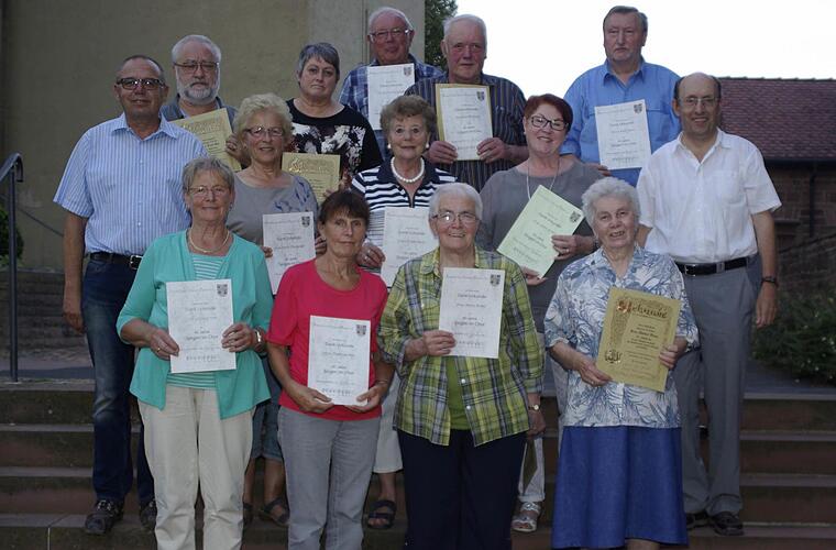 Sängerkreisvorsitzender Gottwald und Vereinsvorsitzende Veth nahmen anschließend die Ehrungen des Fränkischen Sängerbund (FSB) und des Vereins vor. Dabei ragte Hans Glaser heraus, der seit Vereinsgründung - also seit 65 Jahren - dem Gesangverein die Treue hält.