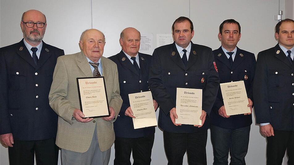 Als Edwin Bold 1944 als 16-Jähriger in die Feuerwehr Windheim eintrat, war noch Kriegszeit. Jetzt wurde er für seine 70-jährige Mitgliedstreue vom Feuerwehrverein geehrt. Eduard Metz wurde für 40 Jahre Mitgliedschaft geehrt. Alexander Nikoleiski und Heiko Wehner für 25 Jahre Treue.
