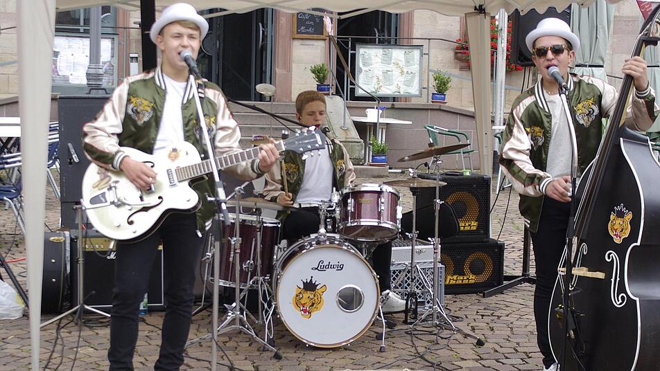 Immerhin konnten die Kusängs (Cousins) aus Eußenheim mit Oldies und Rockabilly-Songs noch einige Dutzend Zuhörer herbeilocken. Toni (Gitarre), Albert (Bass) und Ludwig am Schlagzeug sind 17, 16 und 15 Jahre jung und spielten Musik aus einer Zeit, in der sie noch längst nicht geboren waren. "Die Jungs rocken bereits von Kindesbeinen an", verrät die Mutter eines Bandmitglieds. Elvis' "Money Honey", "Barbara Ann" von den Beachboys - und sogar Chubby Checkers "Let's twist again" - aber auch Titel der Spider Murphy Gang, gehörten zum Repertoire der blutjungen Rock 'n' Roller, die ohne Gage für eine Spende auftraten.