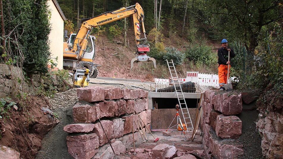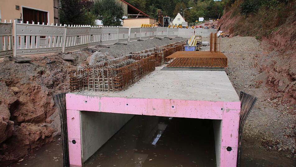 Der Auraer Schrenkgraben ist ein Nadelöhr: In dem engen Seitental nördlich der Saale stehen nicht nur mehrere Anwesen und die Staatsstraße schlängelt sich hindurch. Wenn es regnet, muss dort auch noch das Wasser von knapp zehn Quadratkilometern, also rund 1000 Hektar, abfließen. Das wären bei einem hundertjährigen Hochwasser 12,5 Kubikmeter in der Sekunde. "Der alte Durchlass hätte aber nur acht Kubikmeter in der Sekunde gefasst", rechnet Leonhard Rosentritt, Leiter des Wasserwirtschaftsamtes Bad Kissingen, vor.
