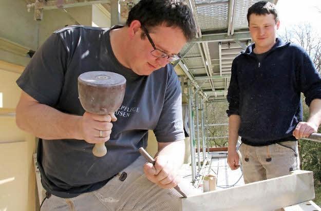 Werkstatt geschnitten und vorgefertigt, aber die Hauptarbeit findet vor Ort statt", berichtet Steinmetz und Steinbildhauer Sebastian Loth von der Denkmalpflege Mühlhausen. Seit knapp einem Jahr arbeitet er am Luitpoldbad. Bis Oktober soll die Fassade fertig sein. "Bei uns ist alles Handarbeit", berichtet Loth und bearbeitet einen Stein mit dem "Eisen", wie die Steinmetze den Meißel nennen.