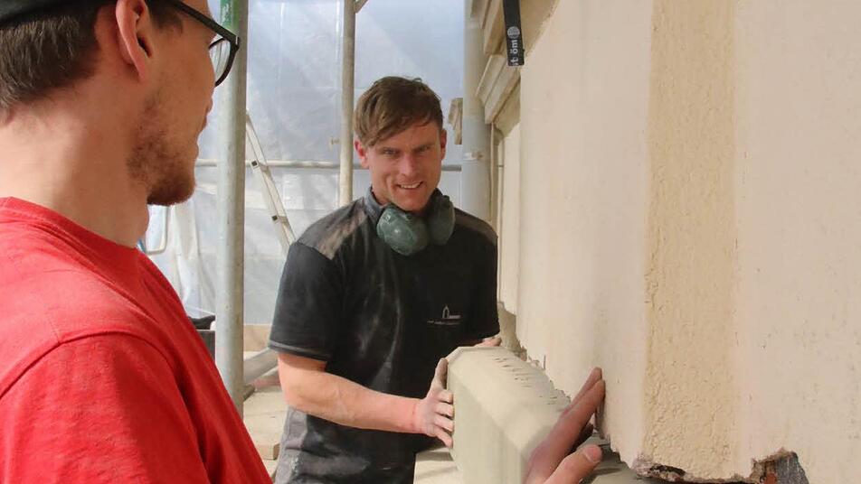 Am anderen Ende des Luitpoldbades arbeiten die Steinmetze der Klettbacher Firma Bennert. "Der Stein ist etwas komplizierter, weil er tonisch gebunden ist", berichtet Steinmetz Georg Richter. Laut Architekt Teichmann ist vor allem Udelfanger Sandstein aus Rheinland-Pfalz verbaut.