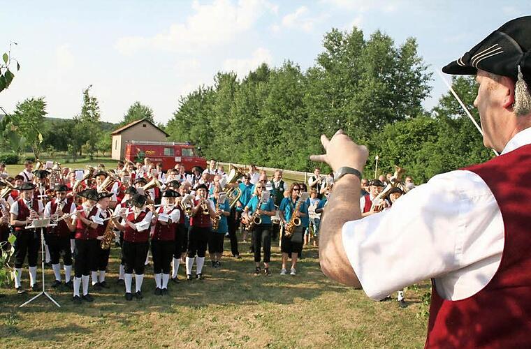 Mit dem Frankenlied "Wohl auf, die Luft geht frisch und rein" begann der Gemeinschaftschor aller Musikanten, und in der Tat wehte am Grohberg immerhin ein leichtes Lüftchen und beflügelte die nahe hundert Musiker zum beziehungsreichen Konzertstück " n Harmonie vereint", das Dirigent Frank Brixel von den Edelweissmusikanten ausgesucht hatte.