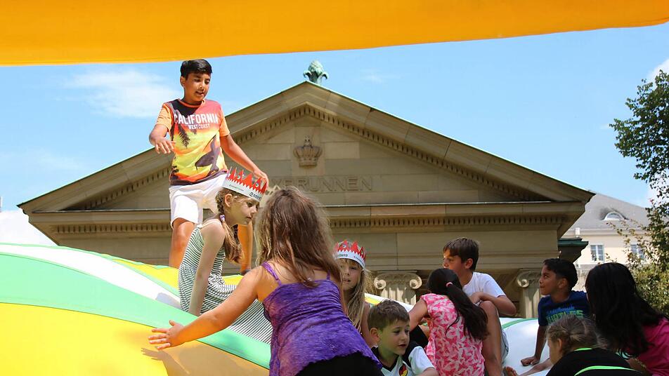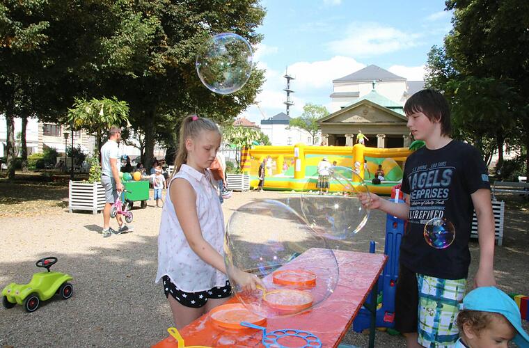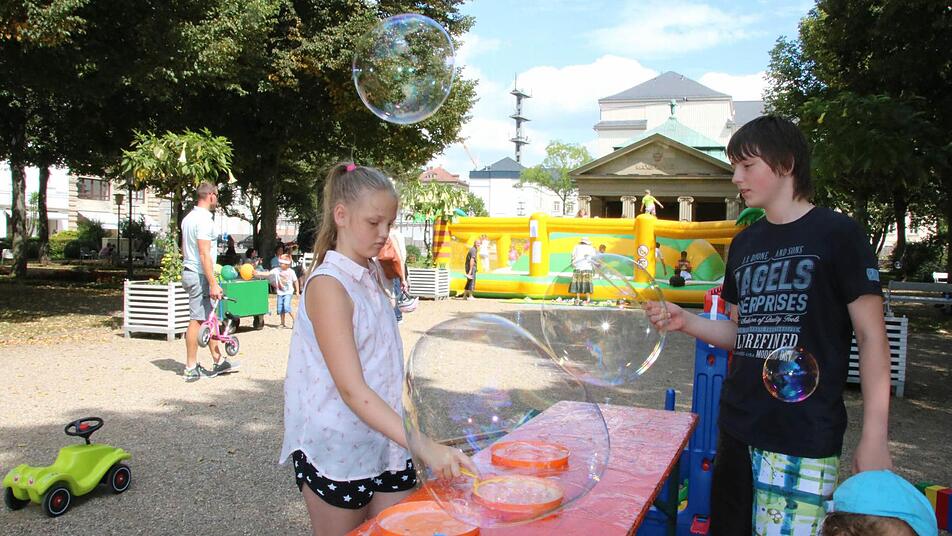 Melanie wackelt auf Stelzen durch den Kurgarten. "Das habe ich seit dem Kindergarten nicht mehr gemacht", ruft die Elfjährige freudestrahlend. Trotzdem kommt sie gut voran. Wieder zurück auf dem Boden, formt sie gemeinsam mit ihrem 13-jährigen Bruder Stefan Seifenblasen. Wo sonst Kurgäste mit Wasserglas flanieren oder den Kurkonzerten lauschen, flogen gestern die bunt schimmernden Gebilde durch die Luft.