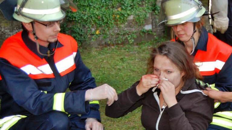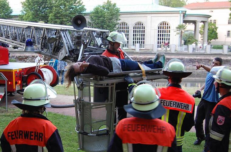 die Fenster gerettet werden", erklärte Albert. "Das muss geübt sein." Einige rußgeschwärzte Leichtverletzte, gespielt von Mitgliedern der Jugendfeuerwehr und altgedienten Freunden der Feuerwehr, hielten sich deshalb im Obergeschoss des Gebäudes auf. Hilferufe hallten in den Innenhof. Junge Feuerwehrfrauen versuchten die Eingeschlossen von unten zu beruhigen, während Männer mit der Leiter kamen.
