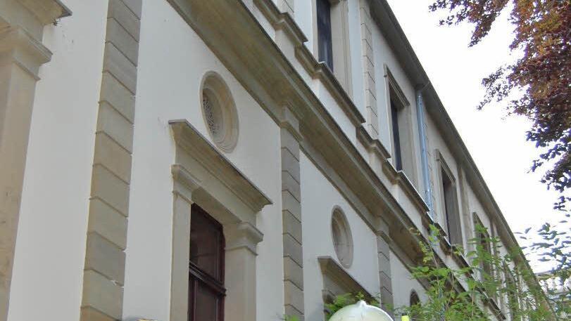 Plötzlich hörte man im Innenhof Schreie aus dem Fenster des benachbarten Umkleideraumes. Eine Rettung über die Leiter ist hier unmöglich: Große Baucontainer versperrten den Helfern den Weg, zudem sind die Fenster nicht zu öffnen. Die Feuerwehrleute drangen über das vordere Treppenhaus ins Gebäude ein und wollten den Verletzten über diese Treppe ins Freie holen.