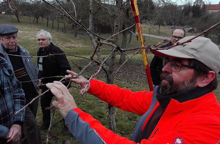 Auf den besonderen Wunsch der Mitglieder boten die Ebenhäuser Eigenheimer in der letzten Woche einen Baumschnittkurs an, der mit 15 Teilnehmern - davon auch vier Frauen - gut besucht war. Für den sehr lehrreichen Kurs konnte Gottfried Röll, Gartentechniker von der LWG (Bayerische Landesanstalt für Wein- und Gartenbau) Veitshöchheim, gewonnen werden. Nach einer eingehenden Einführung in die Theorie ging es zum Praxisteil in die Ebenhäuser Streuobstwiesen hinter dem Schloss, wo es genug Anschauungsmaterial gab. Alle Teilnehmer waren am Ende des Kurses hoch motiviert und soweit gerüstet, um mit Astschere und Säge im heimischen Garten das Erlernte umzusetzen.