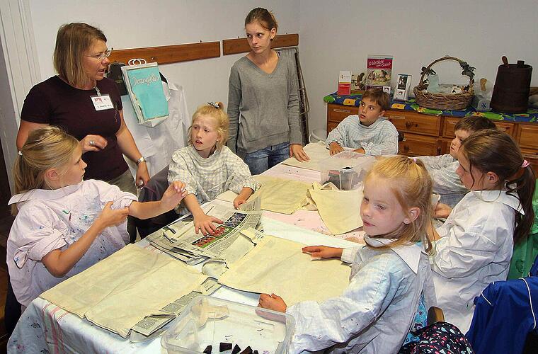 Hier wurden die Kinder von Museumspädagogin Susanne Bocklet empfangen, die sie zuerst ans Flachsbrennhaus führte und ihnen dann beim Rundgang durch das Volkskundemuseum vorführte, wie früher eine Küche ausgesehen hat oder welche Kleidung die Menschen trugen.