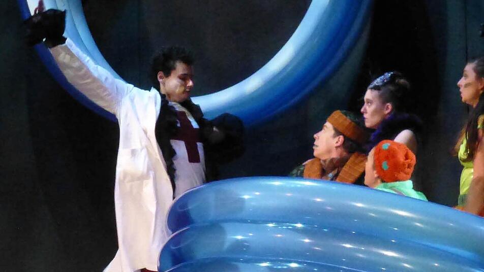 selbstgefälliger, hinterhältiger Doktor und Frosch über die Bühne, Mirjana Milosavljevic trat als Monument einer bösen Stiefmutter auch für Kinder durchschaubar scheinheilig auf. Tochter Antonia spielte Johanna Seitz als junge, selbstbewusste Erwachsene; ihrem Liebhaber vom Südpol gab Julien Feuillet mit hoher Fistelstimme und exzellenter Körpersprache das bizarre Flair eines ganz Fremden.