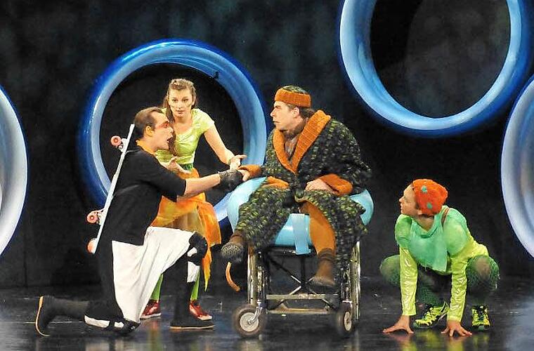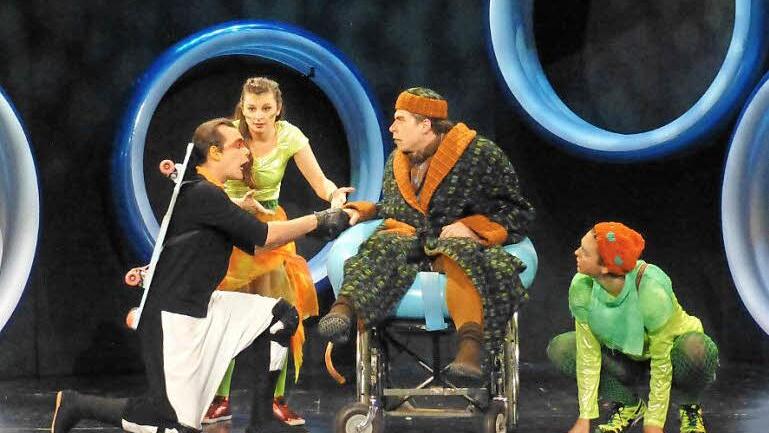 Komplexe Darstellung Und so tobten die fünf Darsteller des Fränkischen Theaters Schloss Maßbach und des Fürther Stadttheaters mit umwerfender Spielfreude in Jutta Reinharts fantasievollen und farbenfrohen Kostümen über die Bühne. Elmar Börger kostete die weinerliche Grantigkeit und ungerechte Dummheit des alten Kröterich genüsslich aus, Georg Stephan stakste wie ein