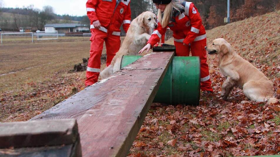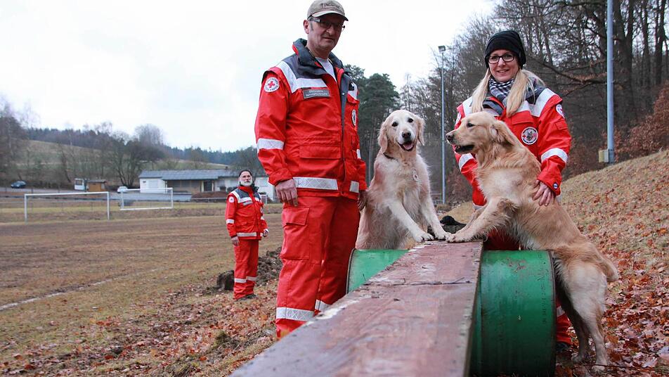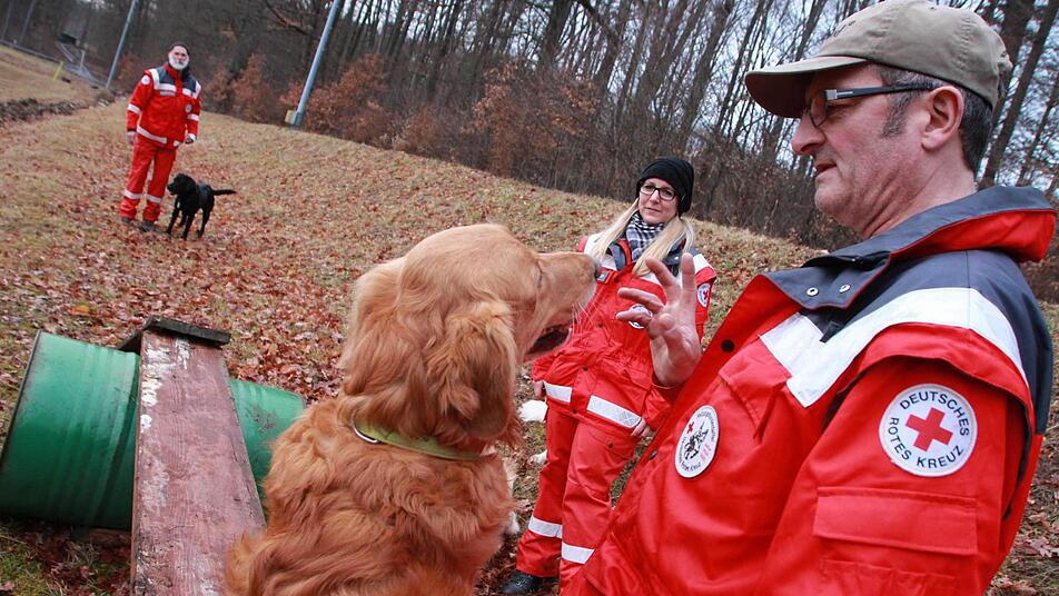 "Ayk" flitzt über die Bohle. Thomas Schuhmann reißt den Zeigefinger hoch. "Halt", ruft er. Der schwarze Labrador stoppt, wartet auf einer Brücke aus zwei alten Fässern und ein paar Holzbrettern auf das nächste Kommando seines Herrchens. Was aussieht wie ein Spiel, soll im Notfall dabei helfen, Leben zu retten. An Ayks Halsband baumelt eine silberne Marke. In der Mitte ein rotes Kreuz. Der sechsjährige Rüde wird gerufen, wenn die Polizei nach vermissten Menschen sucht. "Ayk" ist einer von 24 Rettungshunden der Hundestaffel des Kreisverbands Bad Kissingen des Roten Kreuzes. Kein Mensch ist zu dem fähig, was er kann.
