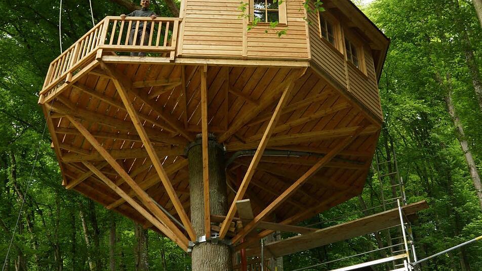 Schulze: "Das besondere an unserer Entwicklung ist, dass die Konstruktion allein vom Baum getragen wird." Die Plattform mit der Hütte klammert sich über Holzverstrebungen an den Stamm.