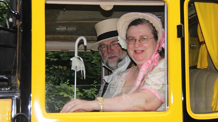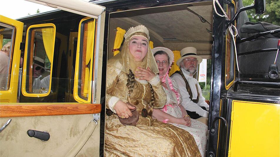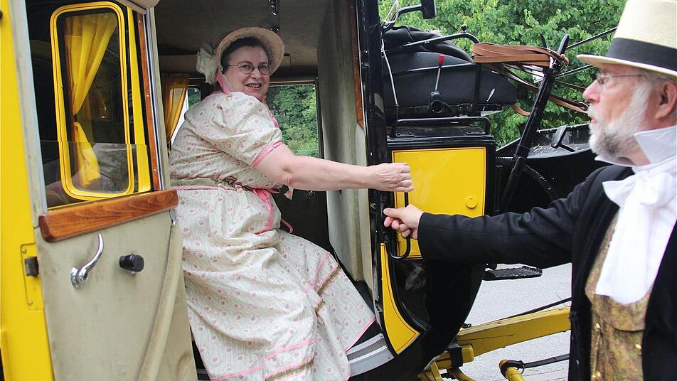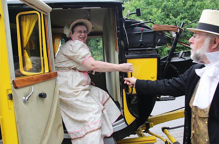 Gewohnt sind die Besucher von Schloss Aschach, dass in den Sommermonaten die alte Postkutsche Besucher heran karrt. Doch dass die Gäste aus der Kutsche im historischen Aussehen gewandet sind, das ist eher die Ausnahme.