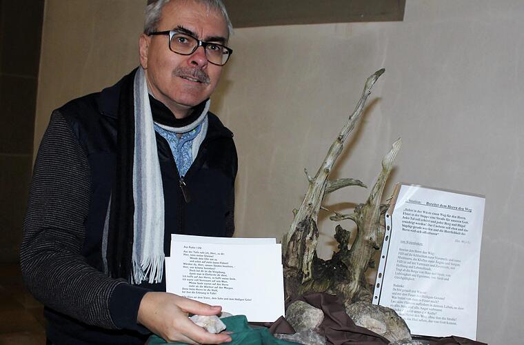 In den Seitengängen der Herz-Jesu-Kirche haben Patricia Steuer und Diakon Christoph Glaser wie schon zur Fastenzeit einen Besinnungsweg aufgebaut. Bereitete der Weg im Frühjahr die Gläubigen auf das Osterfest vor, führt er jetzt an fünf Stationen mit kleinen Installationen, Gedanken und Gebeten durch die Adventszeit, will anregen, geistige Fasttage vom alltäglichen "Christmas-Rummel" einzulegen, lädt ein, still zu werden und der eigenen Sehnsucht auf die Spur zu kommen.