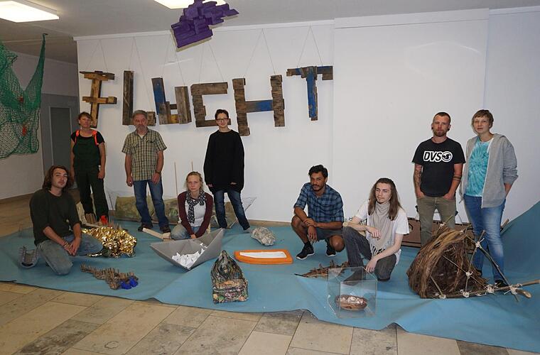Jan Polacek, Fachlehrer an der Berufsfachschule, war Ideengeber für die Rauminstallation. Die Schüler hätten das Thema mit verschiedenen Materialien umgesetzt und zu einer Installation im Foyer der Berufsfachschule aufgebaut, erklärt er. Müll in Gelben Säcken, Drähte und Wurzeln wurden verwendet. Entstanden sind flache Schalen oder aus Papier gefaltete Boote. Sie sind auf blauem Untergrund verteilt, der Schriftzug "Flucht" aus altem Palettenholz prangt an der Wand und wirkt wie Strandgut.