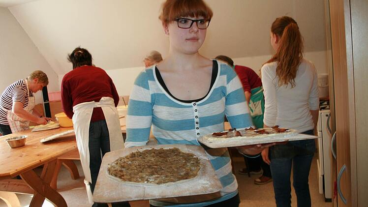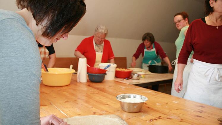 Freitagnachmittag werden im Feuerwehrhaus bereits die Zwiebeln geschält. Das Schneiden erledigt zwar eine Küchenmaschine. Aber das "Andömpfen" (Anbraten) muss wieder von einem Teil der Bäckerinnen übernommen werden. Die anderen Frauen putzen derweil den für das Fest umfunktionierten Feuerwehrraum.