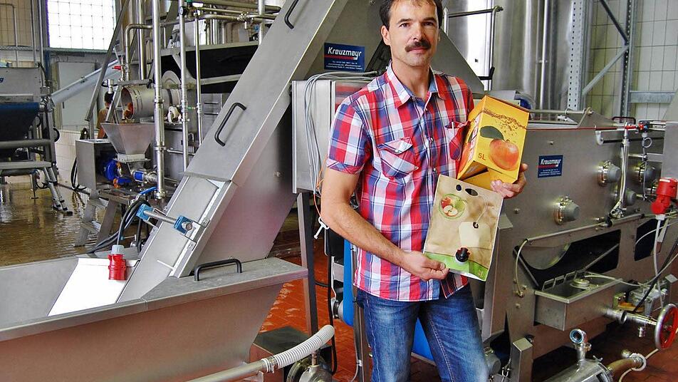 Inzwischen ist auch OGV-Vorsitzender Arnulf Hausdörfer mit seinen Äpfeln in der Kelterei eingetroffen. Ab einer Mindestmenge von 100 Kilo könnte er - wie man es auch von Weintrinkern mit eigenem Rebstock kennt - bei Hofmann heuer zum ersten Mal seine Äpfel mit einer neuen Spezialmaschine zu höchsteigenem Apfelsaft pressen lassen. Dieses kleine Wunderwerk an Technik vereint auf drei Metern Länge, wozu die Kelterei von der Obstannahme bis zum Safttank sonst mehrere hundert Meter braucht. Der "Saft von eigenen Bäumen" wird dann auch in ganz speziellen Drei-Liter-Behältern abgefüllt und für den Kunden individuell etikettiert.