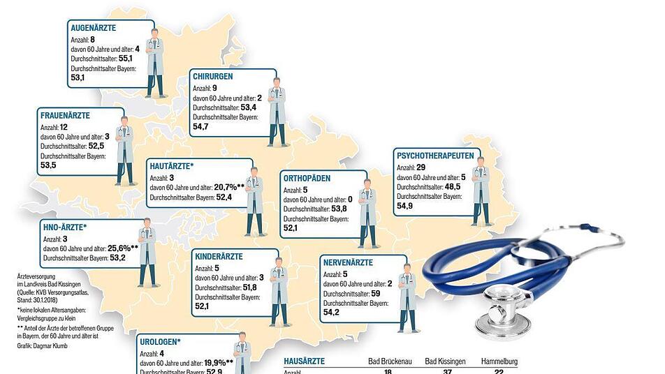 Das zeigen die Daten der Kassenärztlichen Vereinigung schon jetzt. Bad Kissingen ist die einzige Kommune im Landkreis, in der neben den Hausärzten auch alle anderen allgemeinen Facharztgruppen vertreten sind. Bad Brückenau und Hammelburg sind noch relativ gut aufgestellt, wenn gleich es erste Löcher gibt: So fehlen in Bad Brückenau beispielsweise Kinder-, Haut- sowie Hals-Nasen-Ohrenärzte, in Hammelburg gibt es keine niedergelassenen Chirurgen und Hautärzte.