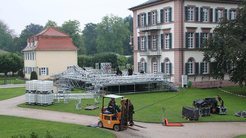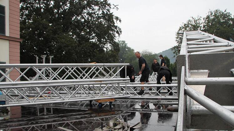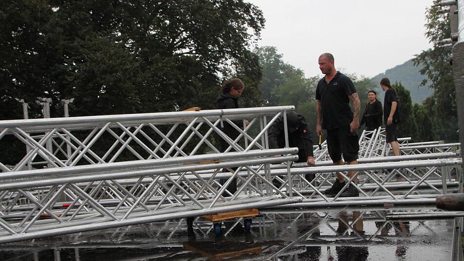 Bei Nieselregen bauten die Arbeiter am Freitag, 23.August, schon das Grundgerüst für die große Bühne auf. "Die Leute, die die Technik für Licht und Ton aufbauen, kommen dann am Samstag", sagt Tom Petschenka, der seit 27 Jahren die Technik für "Provinz Tour" organisiert.