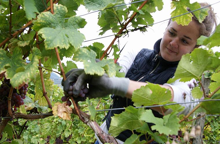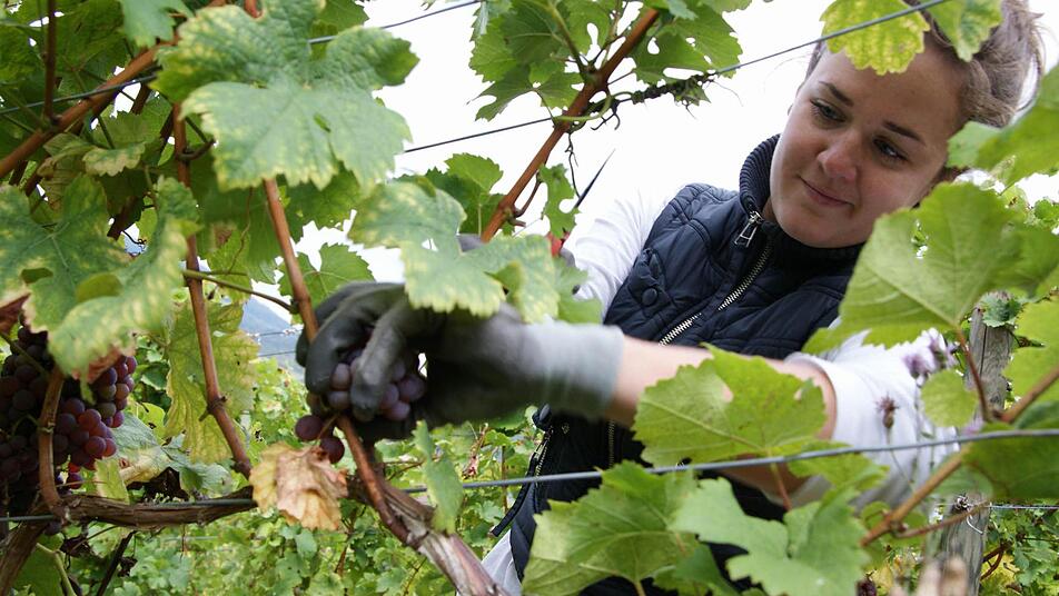 Das erste Souvenir von der Weinlese hat Megan Thiel an ihrem Zeigefinger: Ein Schnitt zieht sich entlang der Fingerkuppe. Die Ernte der Trauben ist anstrengend, sagt Thiel. Der Weinberg ist steil und die Helfer müssen in gebückter Haltung arbeiten. Doch die 28-jährige Kanadierin lässt sich davon bisher nicht schrecken. Zusammen mit Saisonkräften sammelt sie in Obereschenbach die Trauben der Sorte Perle von den Rebstöcken. "Es ist schön, das in der Praxis zu erleben, was ich aus Büchern kenne."