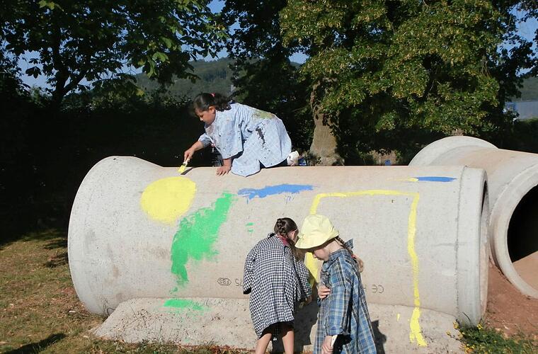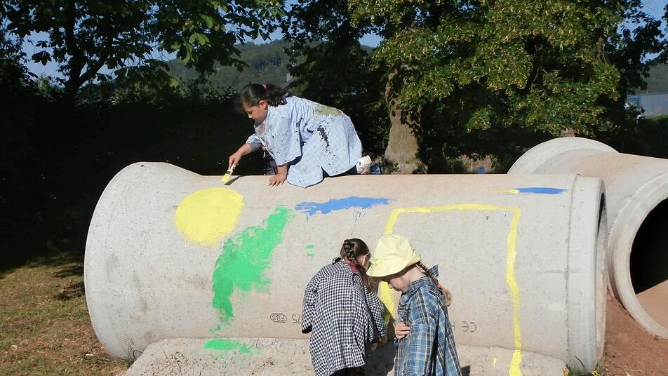 Mit Feuereifer machten sich die Kinder an die Verschönerung der grauen Rohre. Die großen Pinsel und Eimer voller Betonfarbe nutzen die kleinen Künstler für ihr Kunstwerk. So entstanden eine Unterwasserwelt und eine Blumenwiese mit großem Haus.