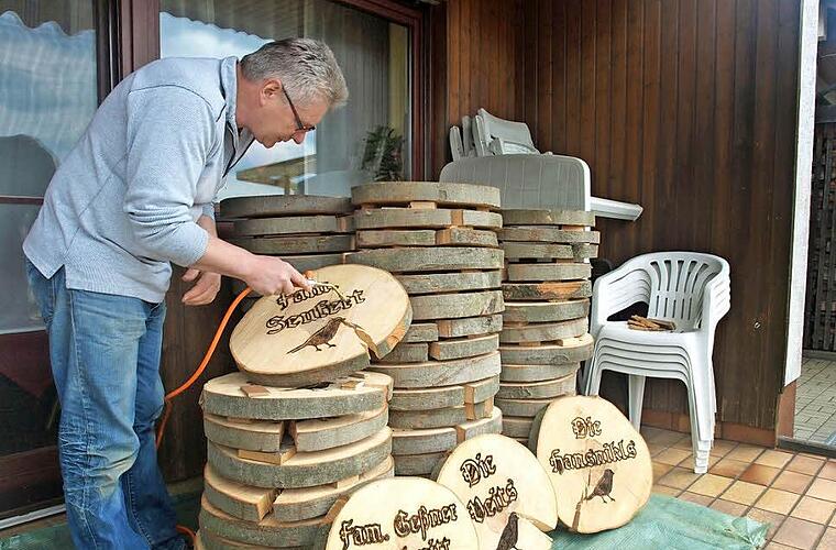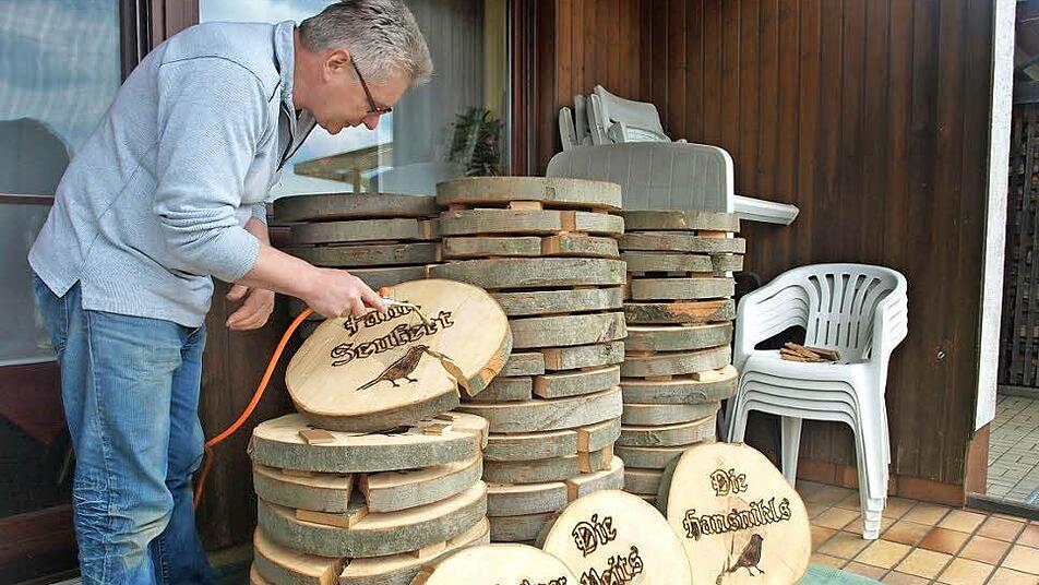 Eine starke Stütze hat Erhard in seinem Stellvertreter Dieter Werner, der sich mit seiner ganzen Familie einbringt. "Seit Monaten dreht sich bei uns alles um das Heimatfest. In den letzten Wochen bearbeiteten wir 85 Baumscheiben, die die Gemeinde zur Verfügung stellte. Die Dorf- bzw. Familiennamen sowie einen Spirken als Symbolzeichen hat Tino Suckfüll eingefräst: "Wir kratzten das Sägemehl aus der frischen Buche und schwärzen Schriftzüge und Spatz mit einem Bunsenbrenner. Parallel dazu sind wir dabei, einen Pavillon zu bauen und Schmuck für Festzelt und Dorfstationen vorzubereiten", erklärt er, der die Festschrift einschließlich Werbung und Chronik der Heimatfeste erstellte.