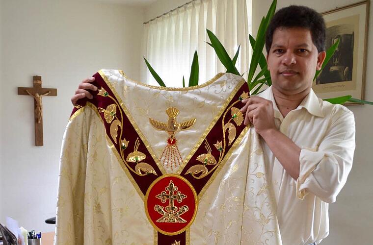 "Ich werde dabei dieses Gewand tragen", sagt er und zeigt eine besonders kunstvoll verzierte Robe. Die hat er von seinem Bruder zur Primiz geschenkt bekommen. Nur einmal hat er das Gewand in den vergangenen zwei Jahren in Burkardroth angehabt. Solange gehört der indische Geistliche schon zum Seelsorgerteam der Großgemeinde. Wie lange er noch bleiben wird, ist unklar und momentan auch nicht wichtig.