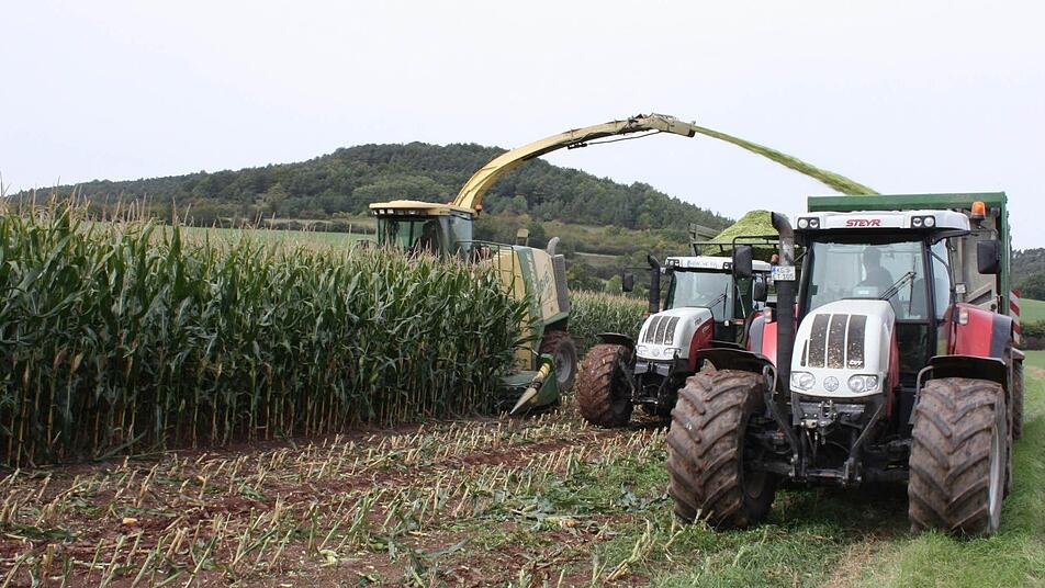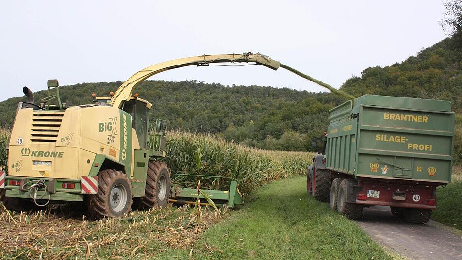Der Anhänger heißt zu Recht "Gigant" und der dazu gehörende Traktor ist auch nicht von schlechten Eltern: Das Duo kann bis zu zehn Tonnen transportieren. Solche Gespanne laufen quasi im Zehn-Minuten-Takt bei der Biogas-Anlage in Bad Bocklet ein. Dort herrscht Hochkonjunktur, es ist gerade Erntezeit für den Silomais. Das merkt man auch an den angrenzenden Feldern: Mais, fast überall wohin man blickt. Fast scheint, es würde diese Pflanze die Region dominieren. Manche sprechen bereits von einer drohenden "Vermaisung".