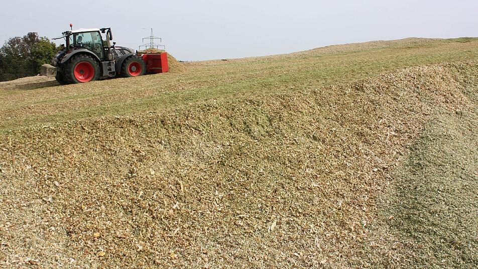 Deshalb war Wallung in der Biogas-Anlage bei Bad Bocklet und auf den umliegenden Feldern. Zwei Häcksler waren im Dauereinsatz bis in den Abend. Jeweils sechs bis acht Abfahrer transportierten die zerkleinerten Pflanzen auf den Hof. Dort nahmen Steffen Krisam oder ein Kollege eine Probe. Dann wurde das Material abgekippt, mittels Schieber zu einem sechs Meter hohen Haufen aufgetürmt und verdichtet, damit es haltbar ist. 2000 bis 3000 Tonnen wurden täglich verarbeitet. 13.500 Tonnen wurden auf 10.000 Quadratmetern gelagert. "Das reicht für ein gutes Jahr", sagt Thomas.