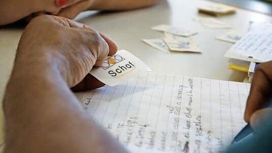 Alicia Friedl hilft ihm, das Wort "heute" richtig zu buchstabieren.