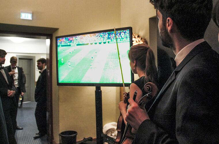 Zurück im Backstagebereich des Regentenbaus. Die Musiker der russisch-deutschen Akademie sammeln sich vor dem Fernseher. Manche wie Thomas Reif haben ihre Instrumente bei sich. Ein paar Minuten sind es noch, bevor sie wieder auf die Bühne müssen. In Sotschi hat gerade die zweite Halbzeit begonnen. Den Ausgleich durch Marco Reus erleben die Künstler live mit, ihr Jubel fällt aber verhalten aus. Sie fokussieren sich wieder auf den bevorstehenden Auftritt. Dann geht es raus auf die Bühne, zu Schuberts großer Sinfonie und zum Zittersieg der Nationalmannschaft.