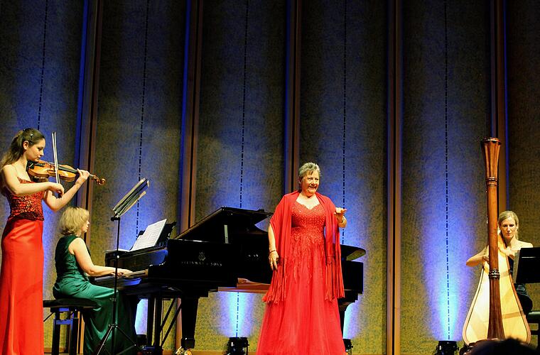 Frontfrau Bettina Kerth mit ausdrucksstarker "Lead" Stimme und drei hochprofessionellen Solistinnen, Zane Stradyna am Flügel, Eva-Maria Vischi, Violine und Birke Falkenroth an der Harfe. Als Quartett, Terzett, Duo oder solistisch zaubern sie ein Klangfeuerwerk auf die Bühne. Gut, es fehlen Nebelschwaden, Lichtorgeln und wummernde Bässe, dafür spielt man in einem traumhaften Saal mit schmeichelnder Akustik.