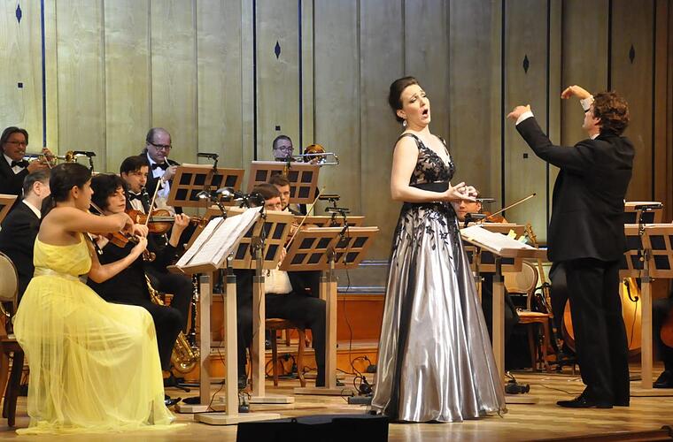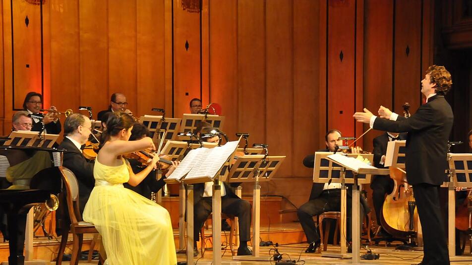 Wer beim Herbstkonzert des Bad Kissinger Kurorchesters im Großen Saal des Regentenbaues eines der üblichen Kurkonzerte vermutete, kam schnell nicht mehr aus dem Staunen heraus. Was die mit Gastmusikern verstärken 17 Musiker zeigten, war erste Sahne. Elena Iossifova, die Leiterin des Orchesters, hatte mit Juri Lebedev ein Programm zusammengestellt, welches im ersten Teil mit klassischen und im zweiten Teil mit Swing-Ohrwürmern glänzte. Juri Lebedev arbeitete schon öfter mit Elena Iossifova und als Gastdirigent mit dem MDR Sinfonieorchester, den Hamburger Symphonikern oder der Staatskapelle Weimar zusammen. "Die Stücke die wir gespielt haben, sind normalerweise für große Orchester geschrieben. Juri Lebedev hat diese für uns neu arrangiert und einstudiert. Sonst hätten wir sie nicht spielen können. Die Ouvertüre aus der Oper "Der Barbier von Sevilla" von Gioachino Rossini (Bad Kissingens berühmter Kurgast) oder das berühmte "Intermezzo" aus Pietro Mascagnis Oper "Cavalleria rusticana" waren Ohrwürmer, die bei dem Zuhörern ein Gänsehaut-Feeling hervorriefen. Aber auch neckische Stücke wie Vincent Youmans "Tea for Two", das der berühmte russische Komponist Dimitri Schostakowitsch als "Tahiti Trott" umarbeitete, bezauberten die Zuhörer. Der "Tahiti Trott" ist das launige Produkt einer Wette des 22-jährigen Dimitri Schostakowitsch mit dem Dirigenten Nikolai Malko. Es ging darum, innerhalb einer Stunde das seinerzeit sehr populäre Stück "Tea for Two" aus dem Musical "No, No, Nanette" für Orchester zu arrangieren. Als Resultat entstand der "Tahiti Trott" in angeblich nur 40 Minuten. Für den gesanglichen Kick sorgte die charmante Sopranistin Barbara Felicitas Marín. Ihr Konzertrepertoire umfasst die Sopran- Solopartien der bekannten Oratorien sowie eine große Anzahl von Werken der Romantik bis zur Moderne. "Kiss Me, Kate" ist das bekannteste und erfolgreichste Musical von Cole Porter. Mit den Songs "I Hate Men!" oder "So In Love" aus diesem Musical begeisterte sie mit einer einzigartigen Stimme auf Anhieb. Besonders kam ihr wunderbarer Sopran bei der schwungvollen Walzer-Arie der Juliette "Je veux vivre" aus Charles Gounods Oper "Romeo und Julia" zur Geltung. Abschließender Höhepunkt war die "Rhapsody in Blue" von George Gershwin und dem Pianisten Denis Ivanov. Denis Ivanov wurde in St. Petersburg geboren. 2001 absolvierte er ein Studium am St. Petersburger Konservatorium und studierte ab 2004 in der Meisterklasse bei Prof. Detlef Kaiser an der Hochschule für Musik Carl Maria von Weber Dresden.