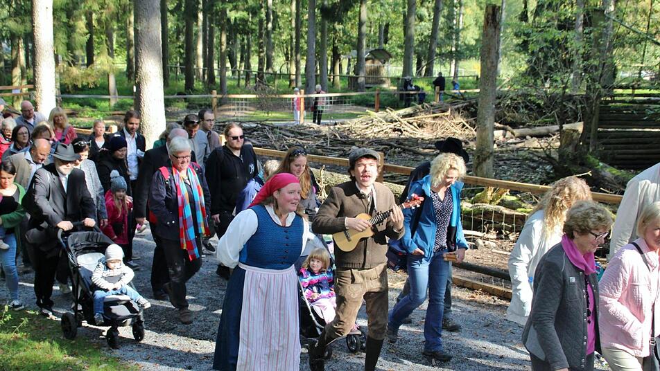 Der spätere Nachmittag gehört dann zwei Künstlern, die nicht besser zum Motto hätten passen können. Da wirft sich die Sopranistin Bettina von Hindte ins Gewand der Hexe Rabenklau und führt mit ihrem Gefährten Falkenbein, (Konrad Naegeli) einen unübersehbaren Tross Kinder mit Eltern, Opas, Omas und sonstigen Besuchern, singend durch den Wald, hält an bei den Wildschweinen, Ottern, am Luchsgehege, bei der Wildkatze und will Hänsel und Gretel aus den Klauen der Waldhexe befreien. Mit Hilfe der aufmerksamen Kinder, den Tipps von Falkenbein und dem Wildschrat gelingt das Unterfangen. "Da wird der Klaushof zum grünen Klassenzimmer und die Veranstaltung zur Umweltbildungseinrichtung" freut sich Axel Maunz, der Leiter des Wildparks.