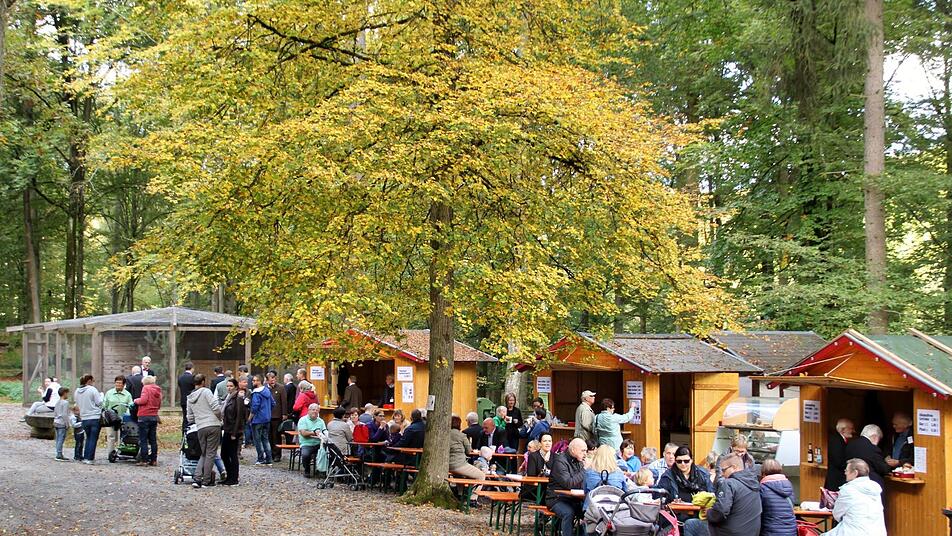 "Musik im Wald", das Motto der Veranstaltung, setzt dann der Männerchor des Fränkischen Sängerbunds stimmungsvoll um. Passend zum Sonntag beginnt Dirigent Hermann Freibott mit geistlichen Liedern, aber dann kommt der Wald ins Spiel mit klangvoller Reminiszenz an die Romantik, an die Burschenschaften und die Liebe zur Natur mit dem "Lindenbaum", Chamissos "Hab oft im Kreise der Lieben im duftigen Grase geruht" und vom "kühlen Grunde" mit dem Mühlenrad und dem Liebchen, das verschwunden ist. Passend zum Motto, klangschön eindrucksvoll der Gesang, kontrastreicher Farbtupfer zum Jägergrün der Bläser hingegen das klassische Schwarz mit roter Fliege der Sänger vor der Waldkulisse.
